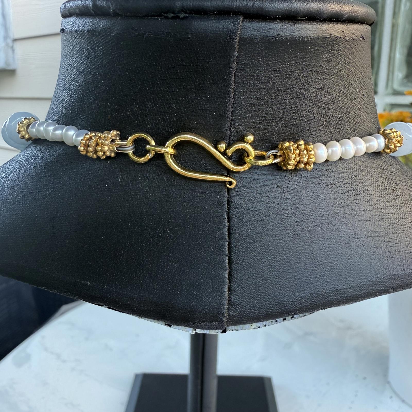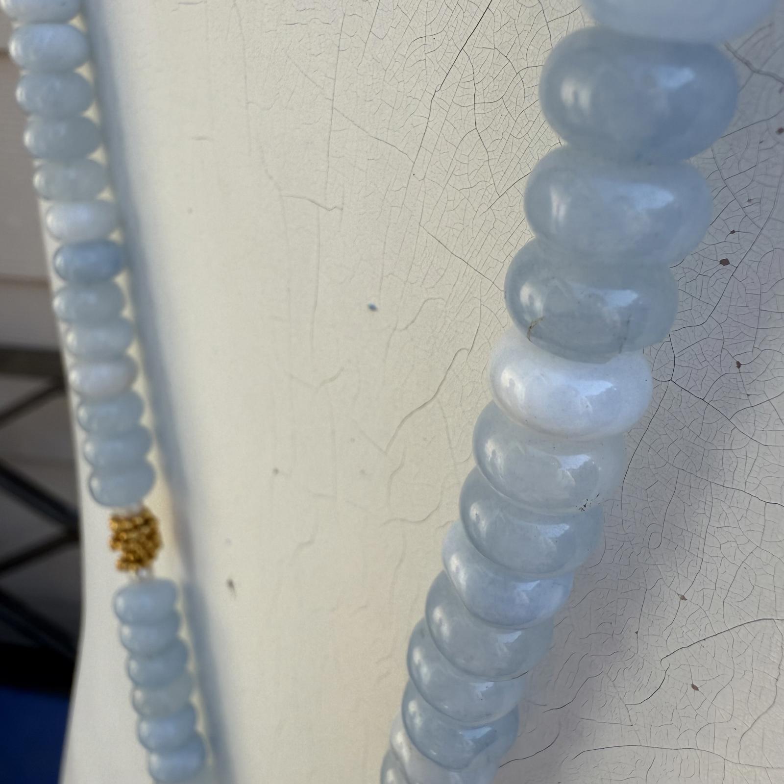 The pendant is hand-strung on a necklace of natural polished aquamarine beads, with soft translucence and serene blue tone, complimented with freshwater pearls, gold-toned spacer beads and finished with a gold-tone hook closure. Measuring 33 inches in length, this versatile design can be worn long or doubled for a layered look. The guilded cross measures 2½-inch long by 2¼-inch wide. The polished aquamarine roundels are 10mm X 5mm. This is a great piece for collectors of fine vintage and artist-made jewellery.