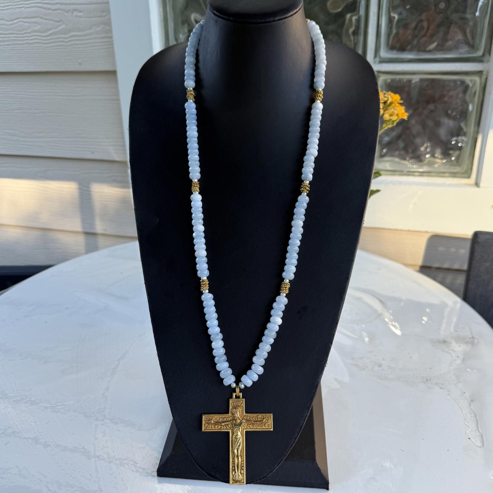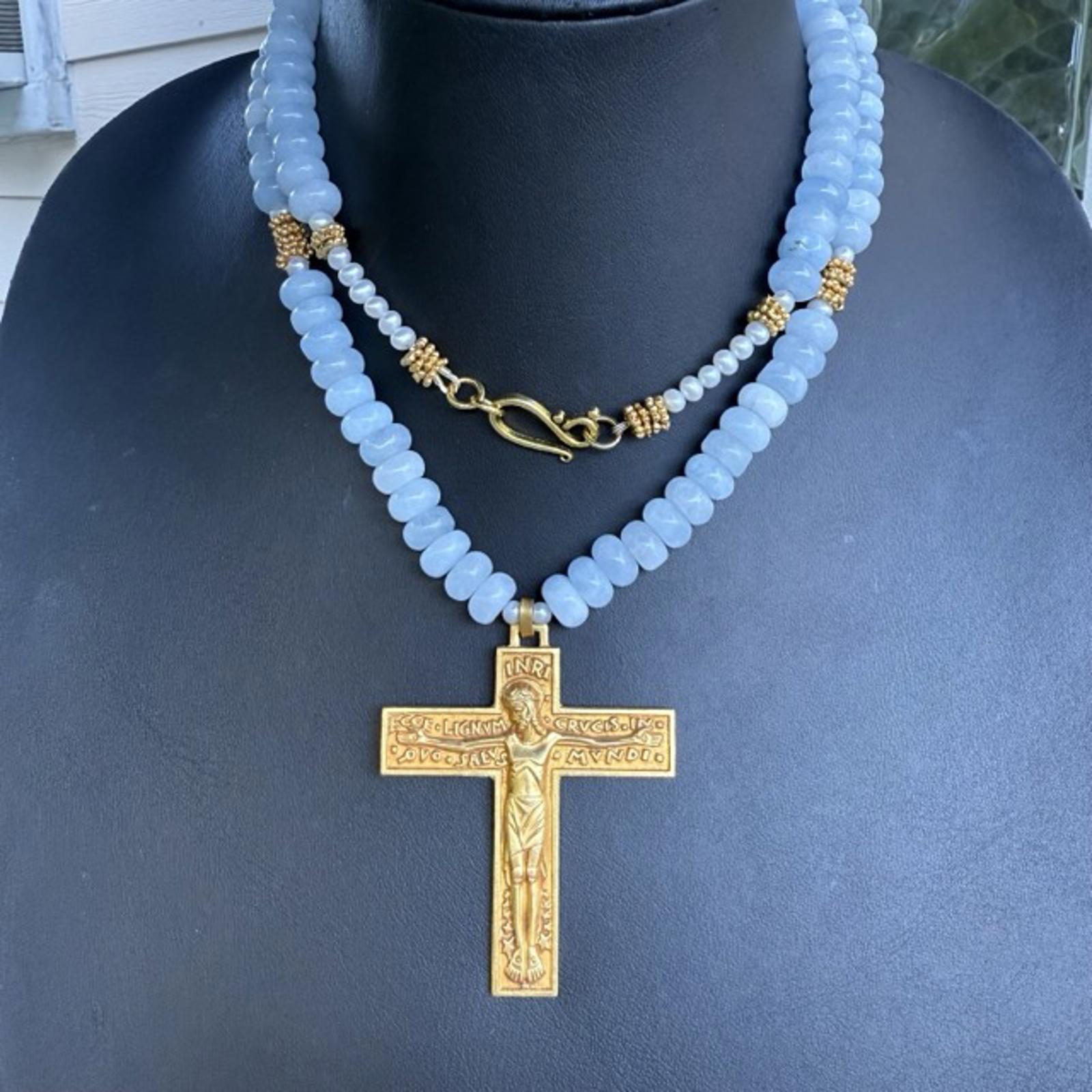 Art Deco French Gilded Crucifix. Aquamarine Freshwater Pearl Necklace.