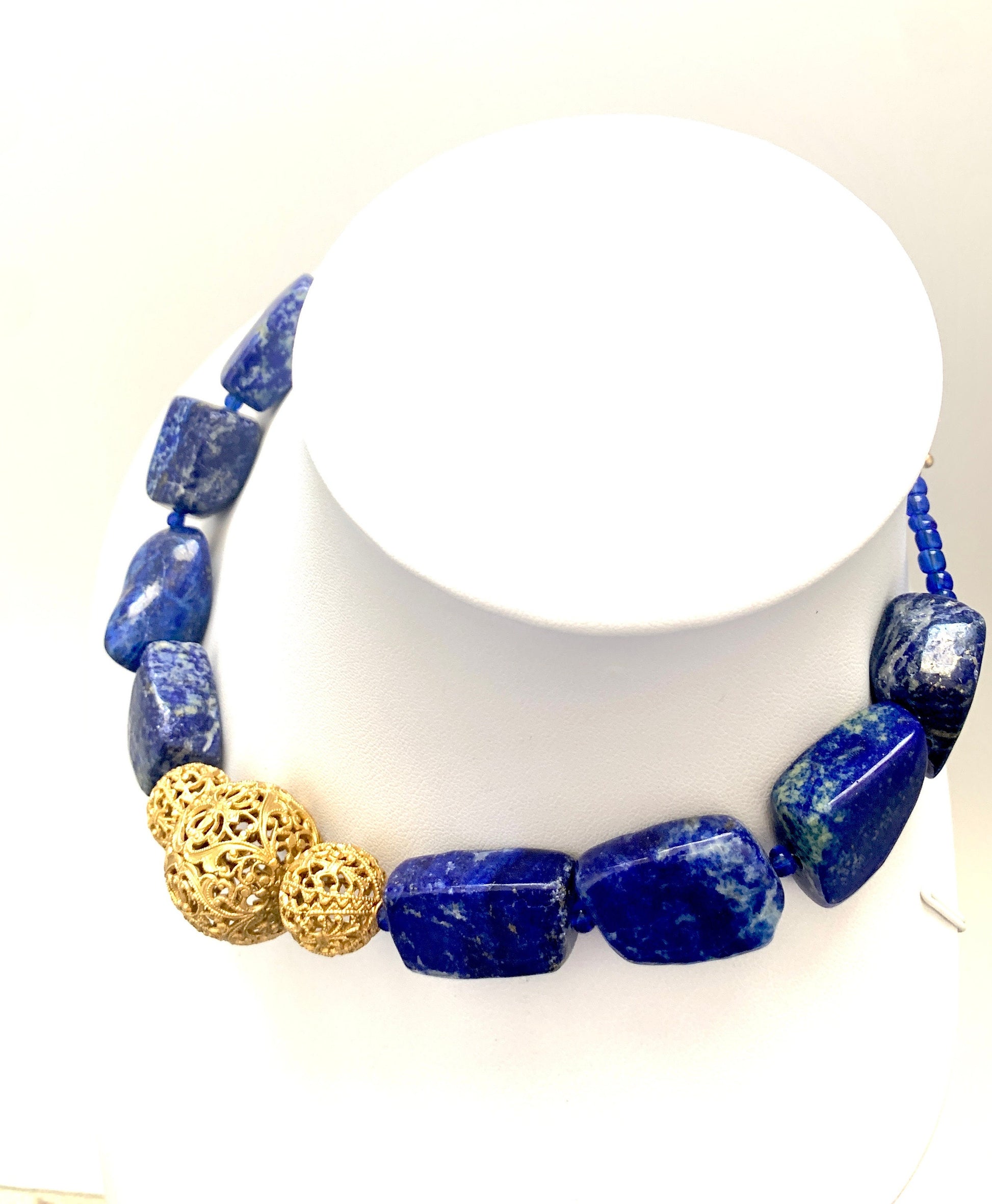 Lapis Lazuli. Polished irregularly shaped blue nuggets with gold & white hues. Vintage gold-toned filigree beads from the 1950s. This necklace is a stunning piece that can be worn as a casual or dressy piece. that measures 18.75" in length and can be worn with the gold-tone filigree baubales on the right or left side if, worn in the centre you will see the glass spacer beads, see pictures of how this would look.