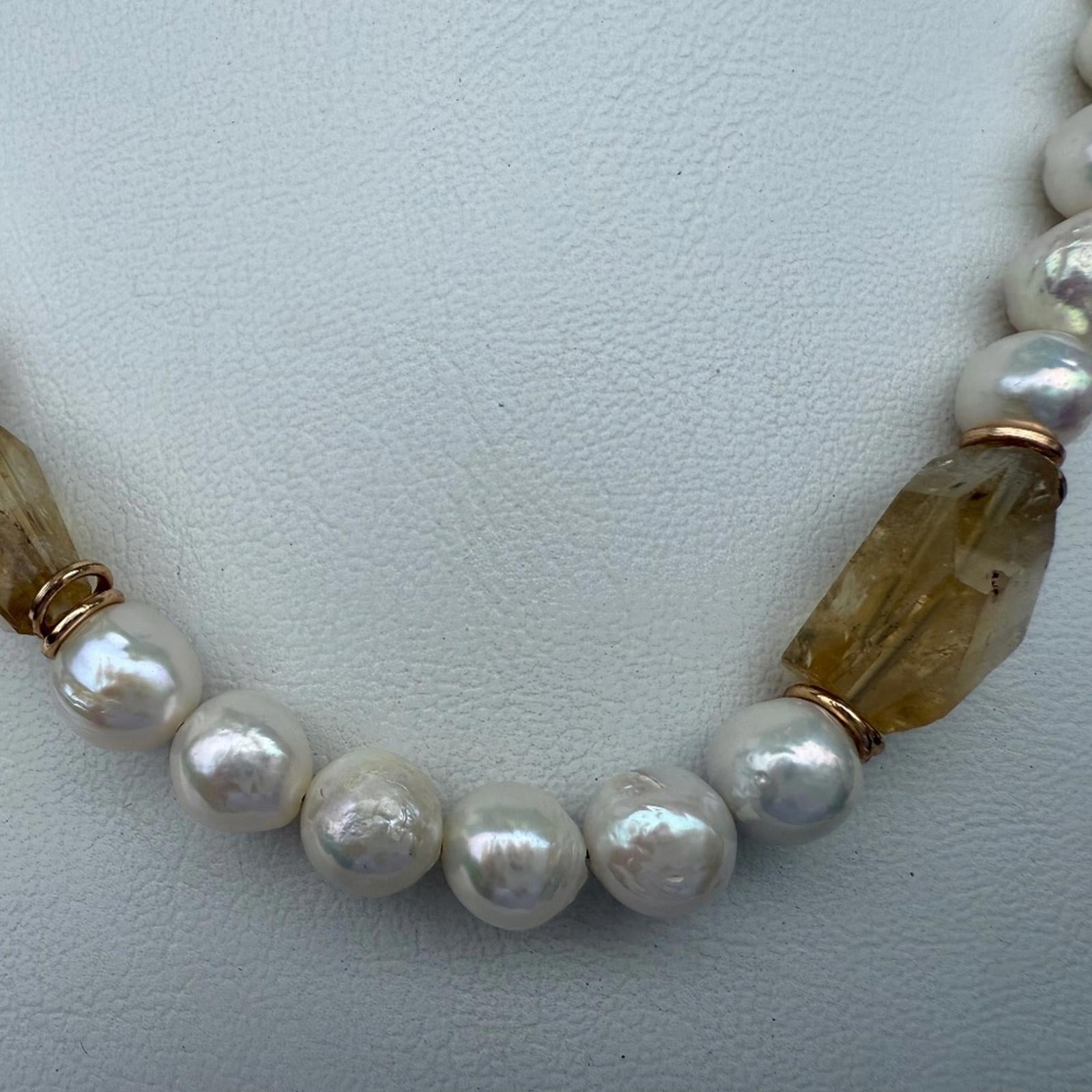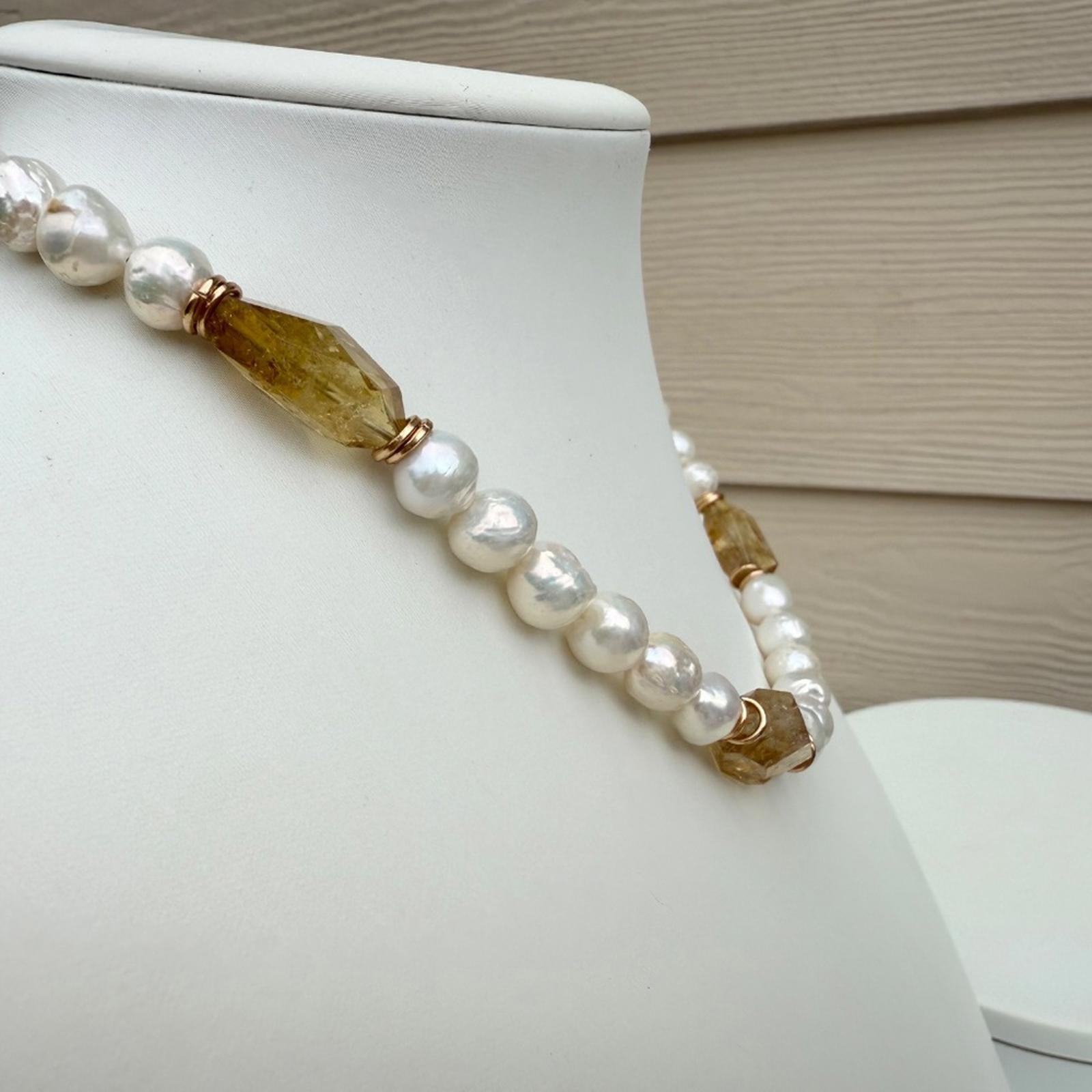 Handmade citrine and pearl necklace, made by me. Natural citrine and pearl necklace. Faceted and polished natural citrine nuggets that are approx. 1.75" (2cm) x .50" (13cm) wide (at the widest part) and the opalescent pearls are in the 6/16" (1cm).