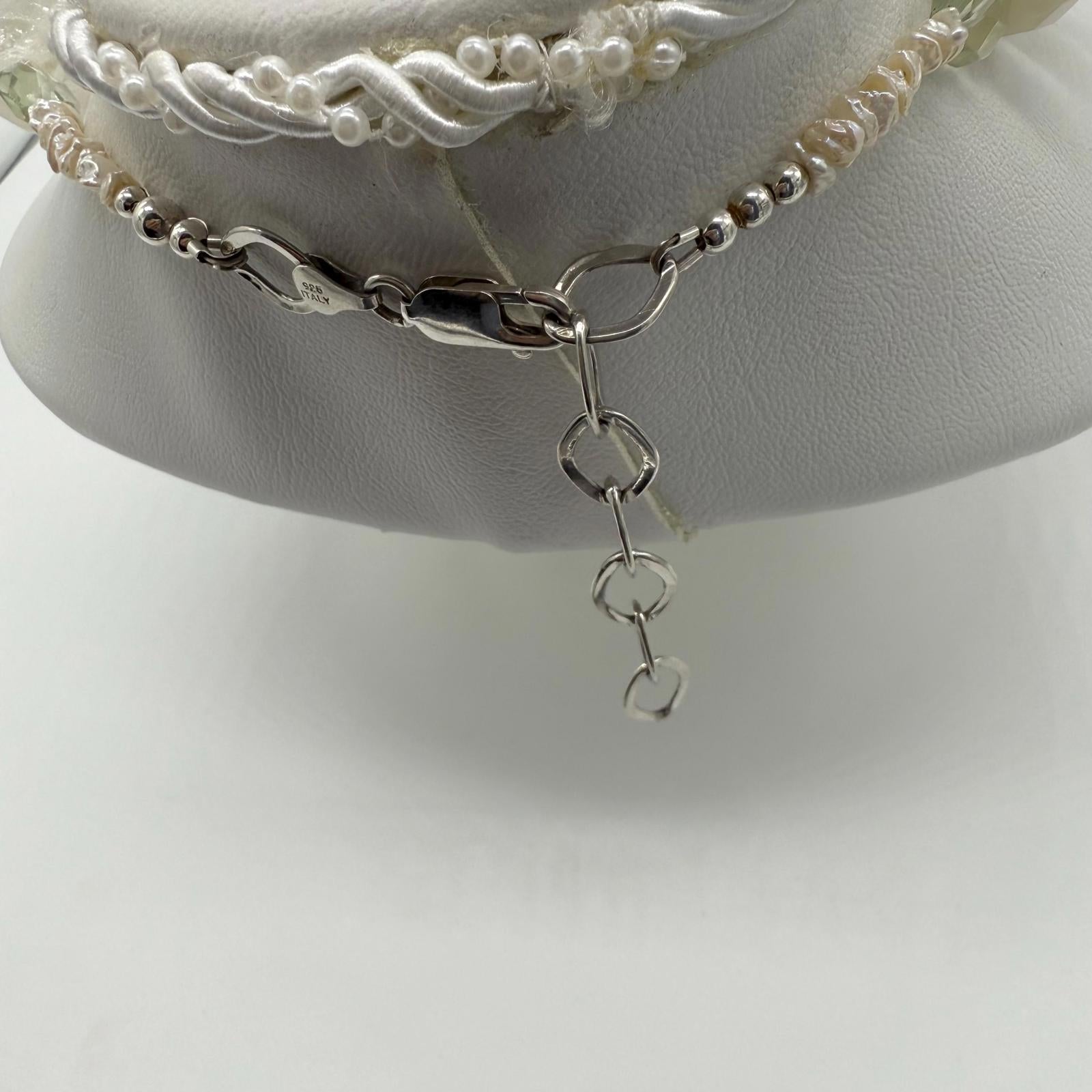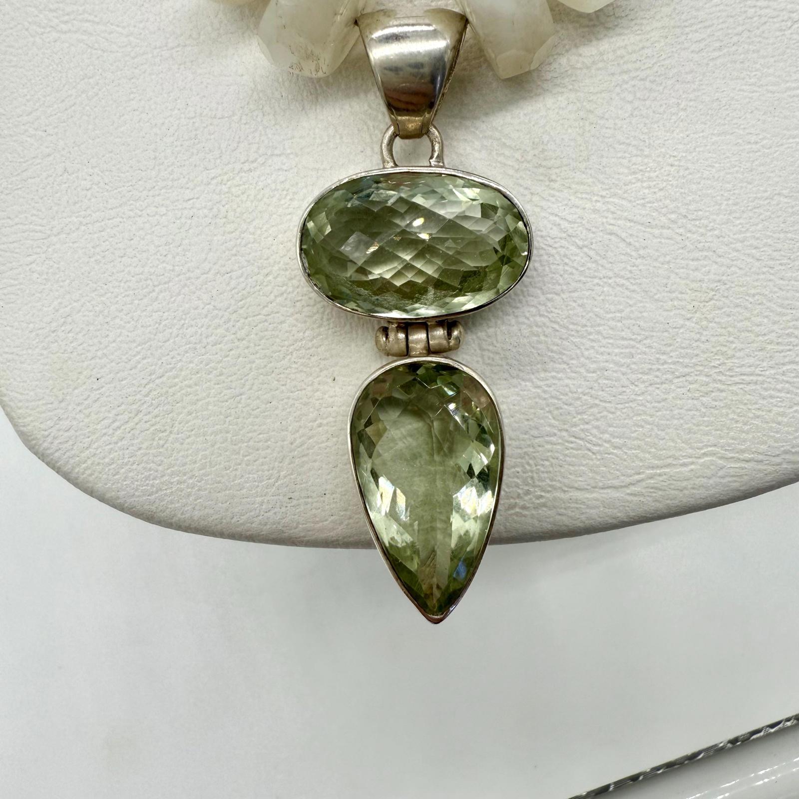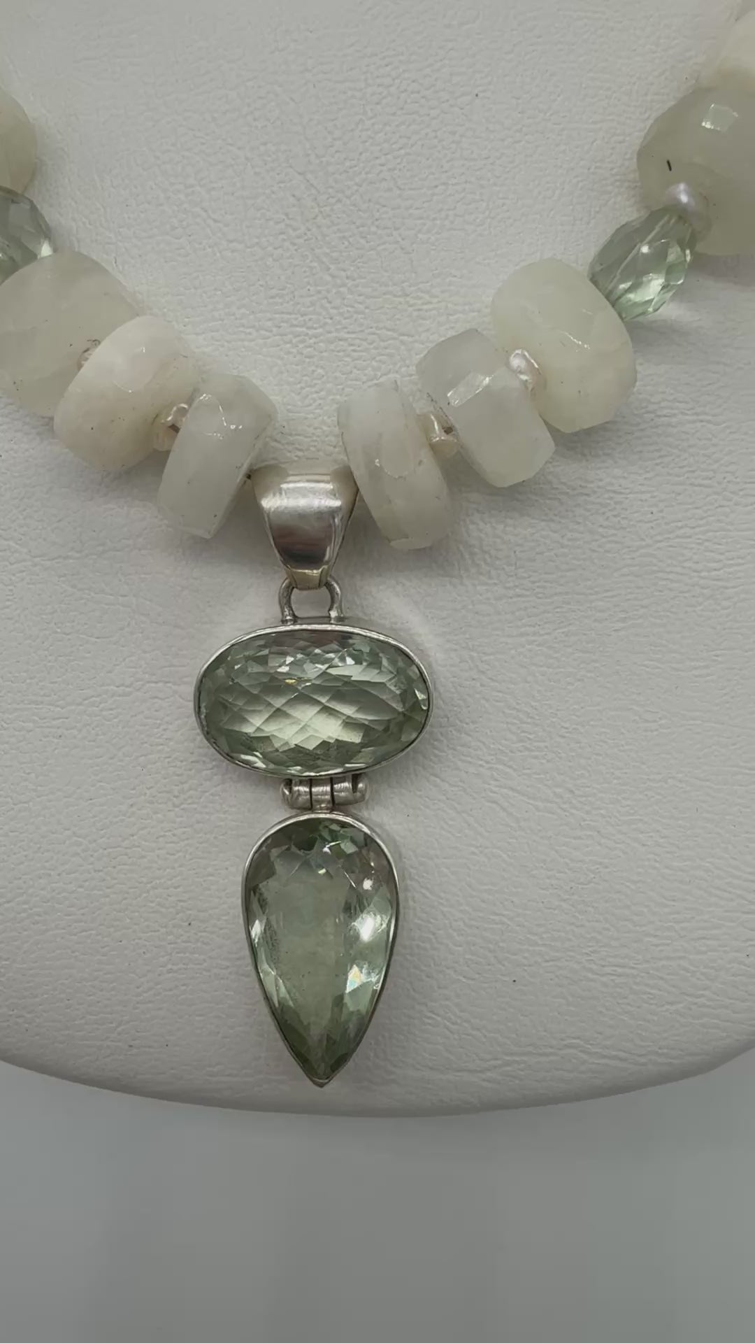 The necklace is handmade with faceted moonstones that glimmer with soft iridescence, accented with 8 faceted green amethyst nuggets, and tiny freshwater pearls for a refined balance of color and texture. The pendant hangs approximately 2.5 inches (including the bail), while the necklace measures 18 inches with a 2.25-inch sterling silver extender and lobster clasp, allowing it to be worn at 18 to 20.25 inches.