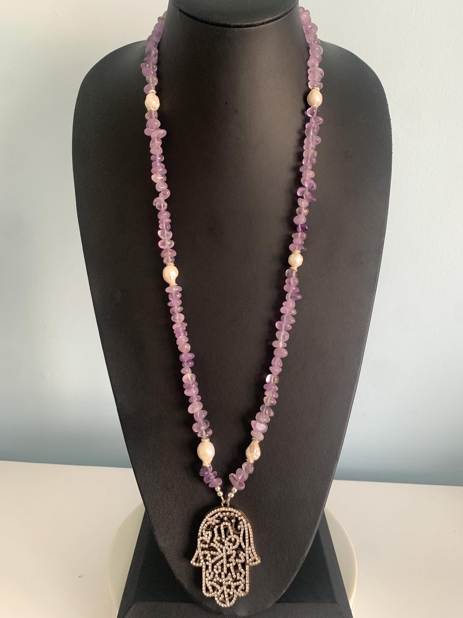 Purple amethyst polished nugget chips, baroque pearls & silver spacer beads. Handmade necklace. The Hamsah was sourced from one of my vintage vendors but I do not believe it is a vintage piece, maybe from the early 2000s.