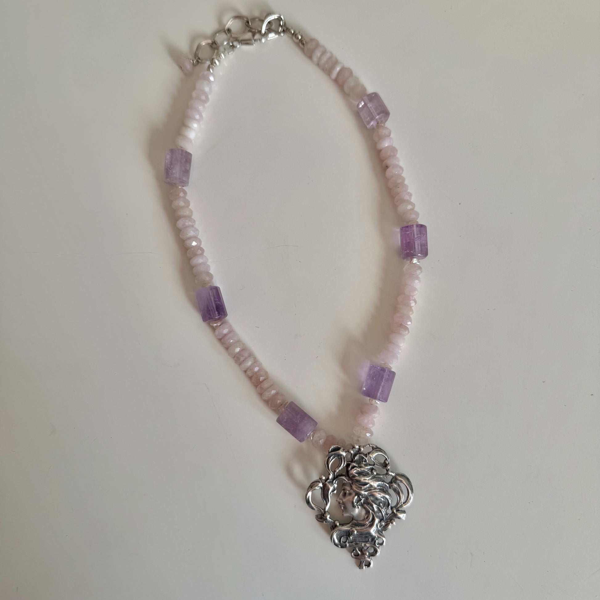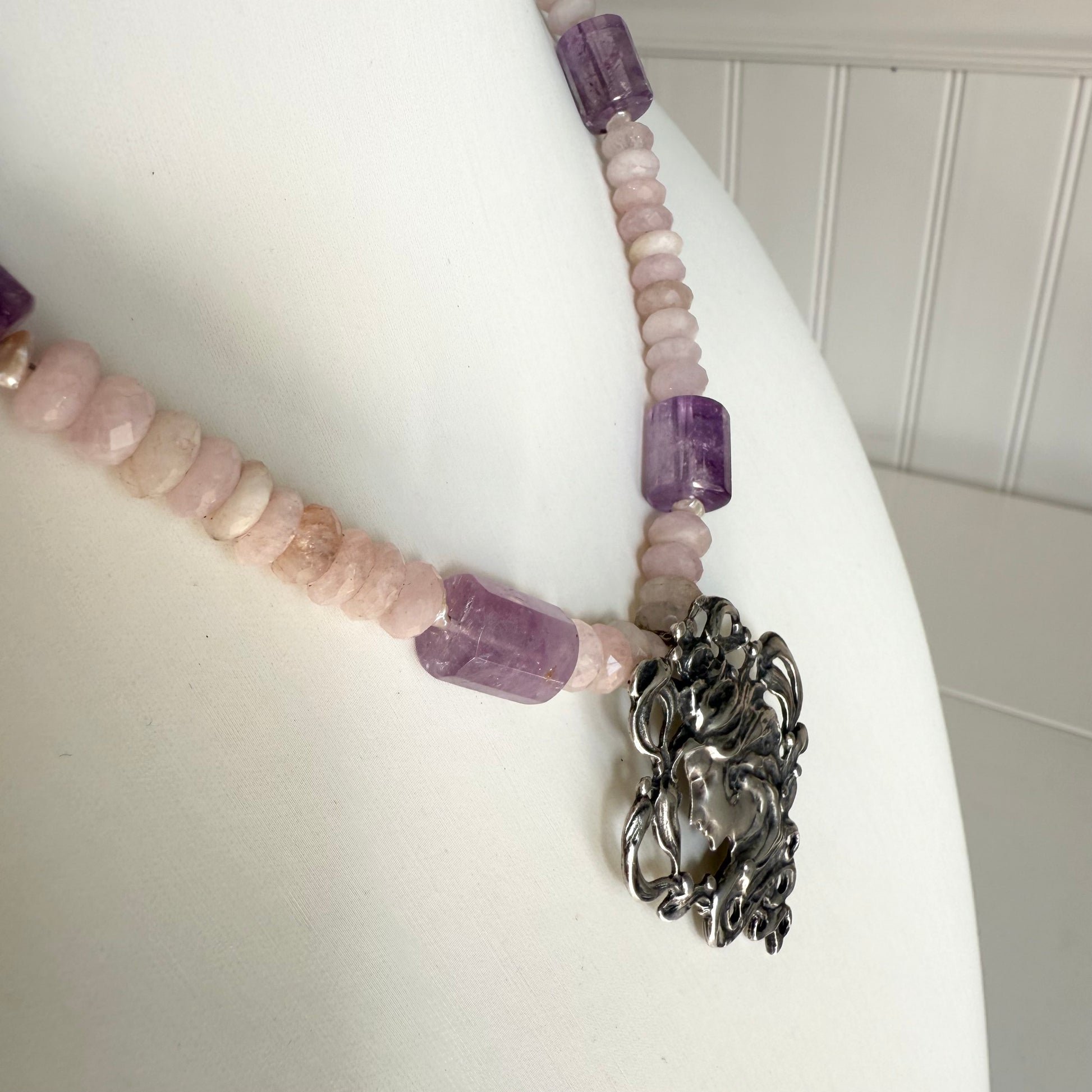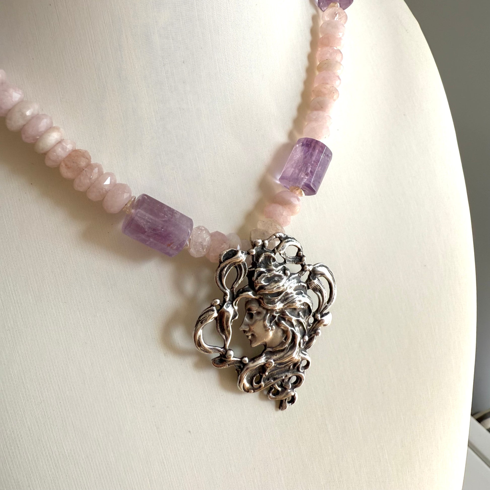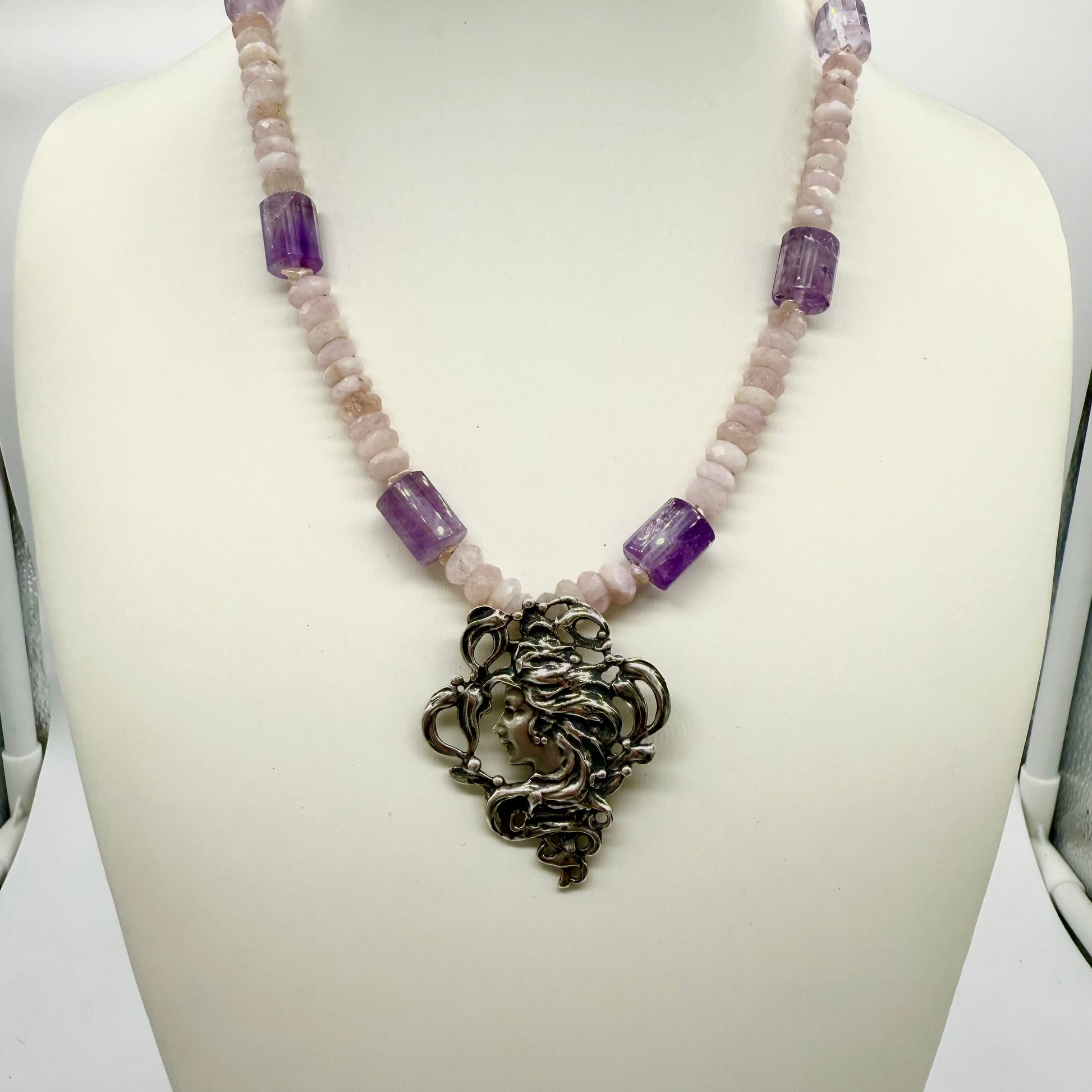 Pretty vintage sterling silver 1920s Art Nouveau lady pendant necklace, originally designed as a brooch and pendant. The handmade beaded necklace has tubular faceted .50" lavender amethyst stones with .25" very pale faceted rose quartz roundel stones and tiny freshwater pearls. Finished with sterling silver crimp bead and cover with a sterling silver lobster clasp. Necklace is 18" with a 2" extender and can be worn 18"-20". OOAK Vintique10 creation.
