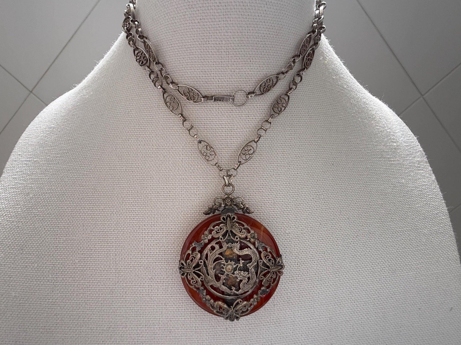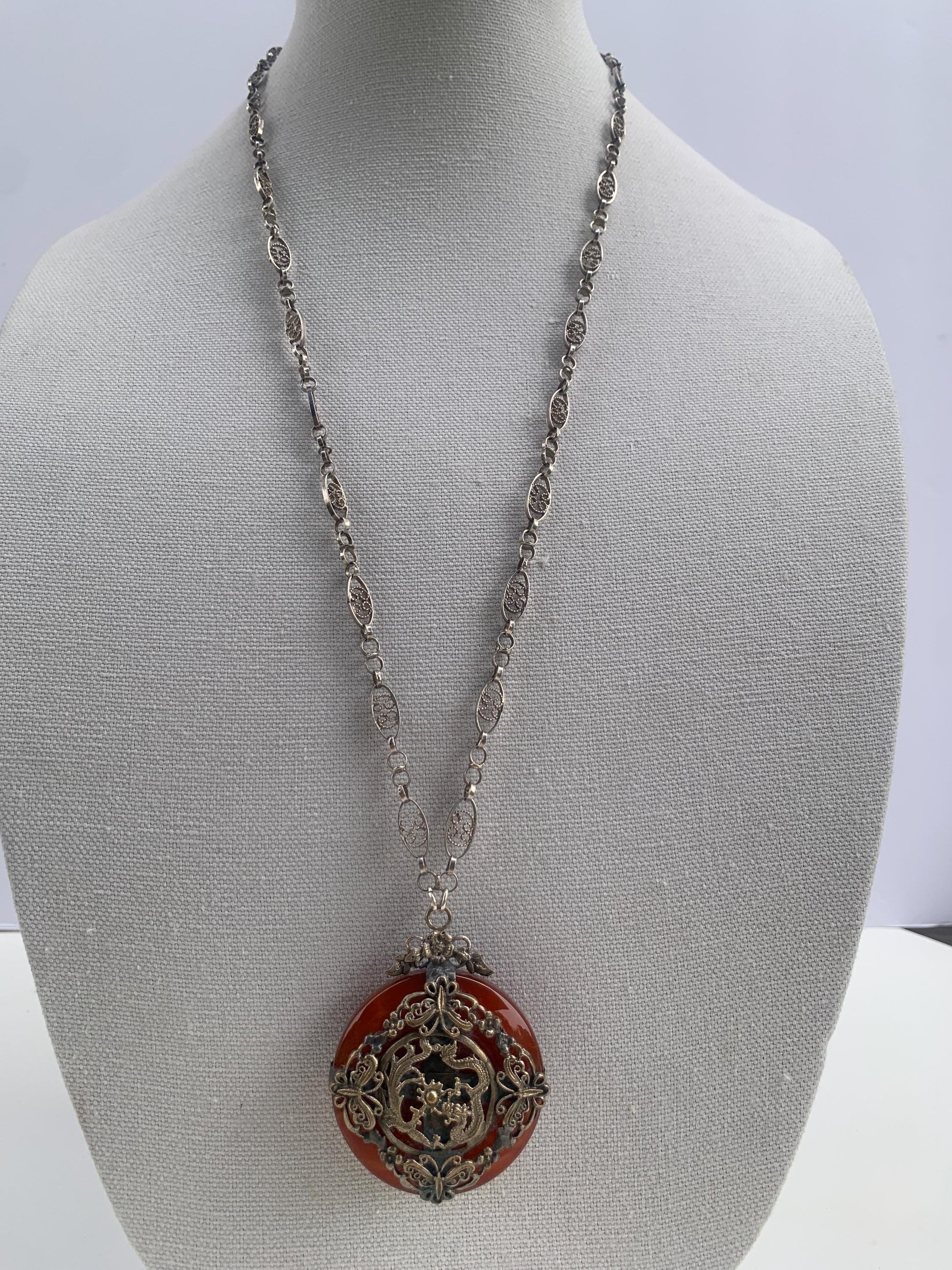 Vintage carnelian agate stone with Asian-inspired dragon pendant, on a 30" long sterling silver filigree Mexican wedding chain. The pendant has a silvery grey metal overlay dragon design on the front & back. The carnelian agate stone is 1.75" in diameter. In Asian cultures, the dragon symbolizes power, strength & good luck. The dragon is also associated with prosperity, protection & success.