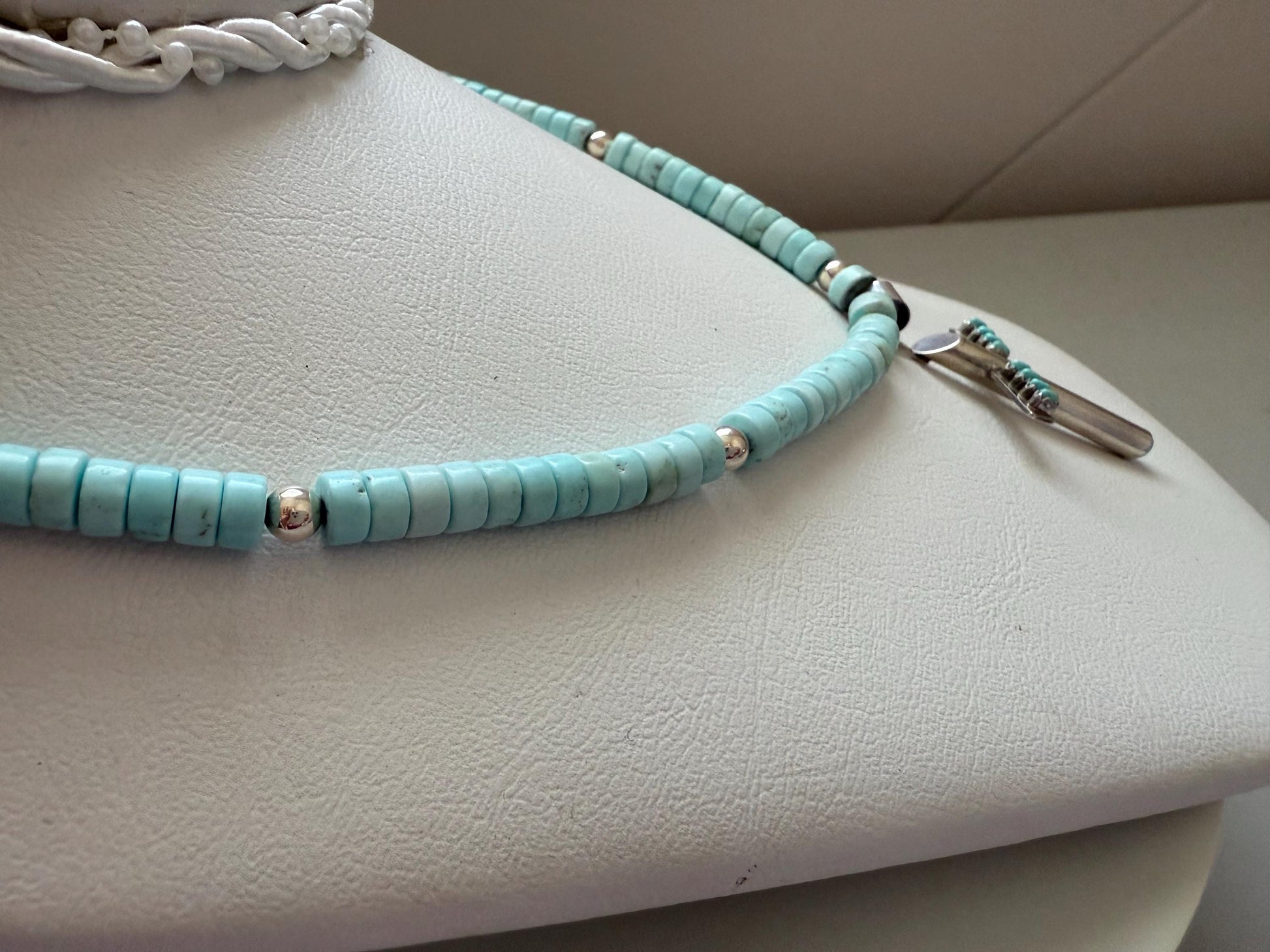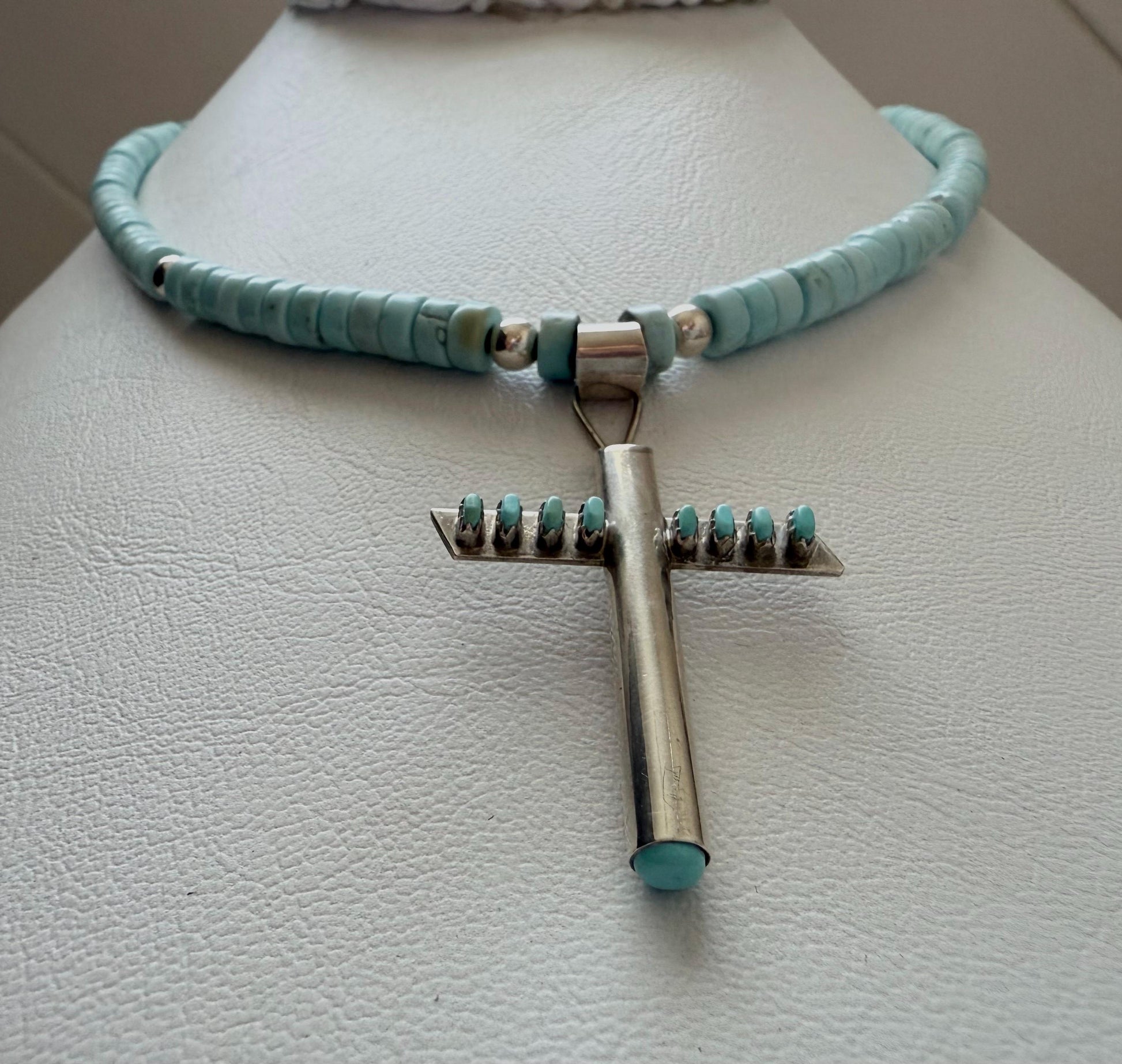 Vintage Sterling Silver Cross necklace. Handmade Turquoise Heishi Necklace. Bezel Set Turquoise cross.OOAK.RWAG