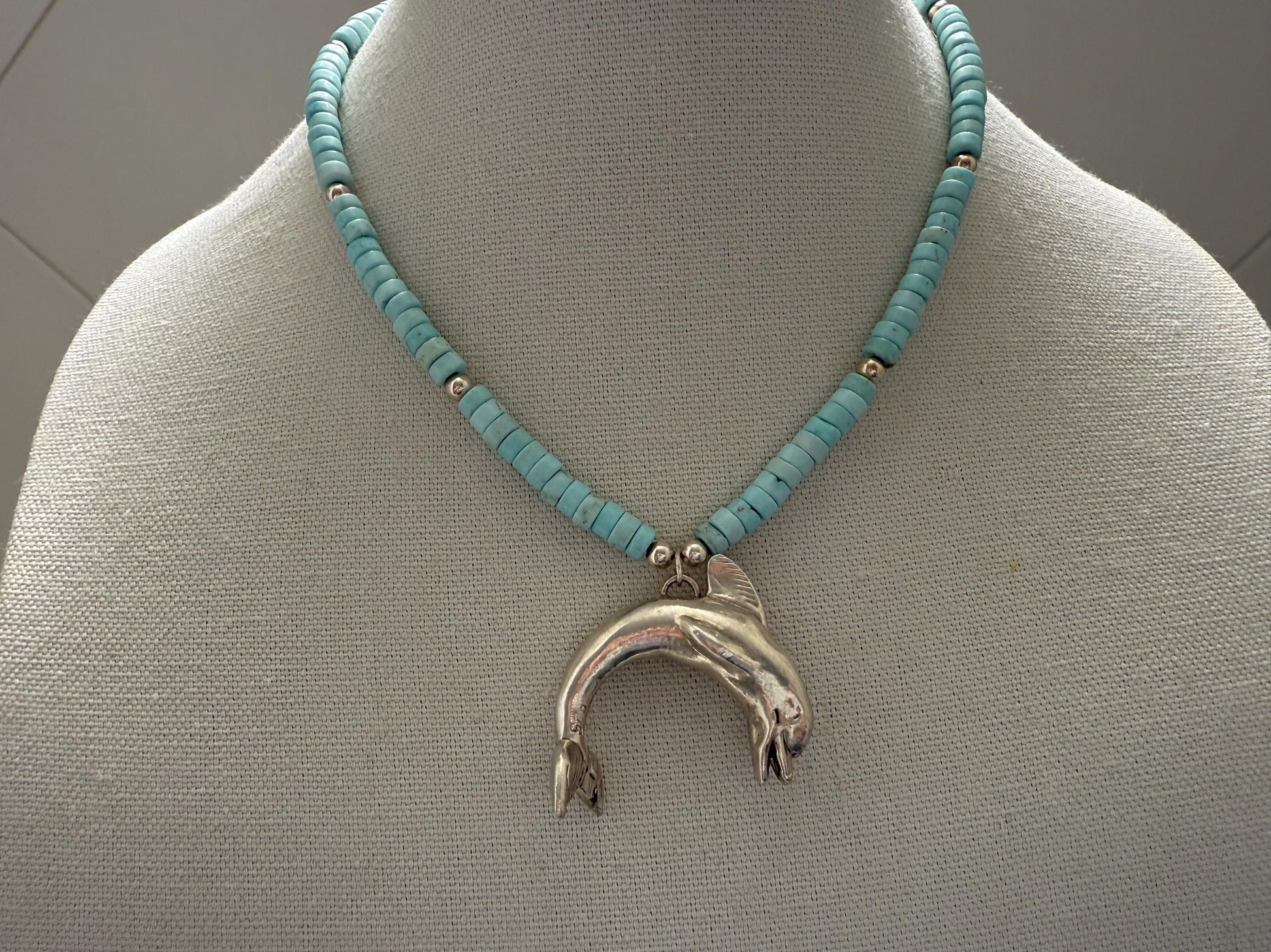 Vintage. Sterling Silver. Dolphin. Handmade Light Blue Turquoise Heishi Necklace.